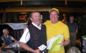 Our Event Chair Myles Richmond (in yellow) and a happy Mount Seymour winner, Clar Dickson